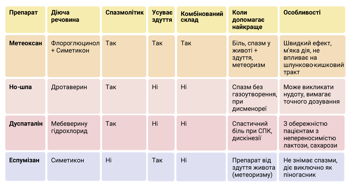 Щоб наочно зрозуміти, в чому різниця між Метеоксаном та іншими популярними засобами від спазмів у животі, порівняємо їх склад та властивості. Це допоможе обрати препарат, який підійде саме вам залежно від симптомів і ситуації.
