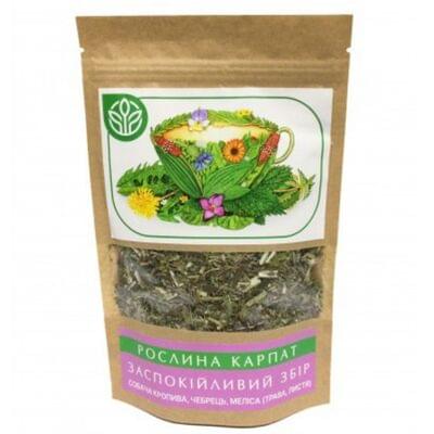 Фіточай Рослина Карпат Заспокійливий збір може бути рекомендований як природне джерело біологічно активних речовин при підвищеній збудливості центральної та периферичної нервової системи. Має виражену заспокійливу, болезаспокійливу дію. Знімає напади тахікардії. Сприяє нормалізації сну.