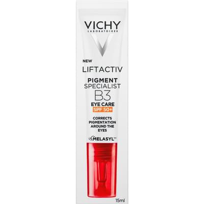 Крем для корекції пігментних плям та темних кіл у зоні навколо очей Vichy ЛіфтАктив Пігмент Спеціаліст В3 SPF 50+ високий ступінь захисту - ефективно бореться з проблематикою появи небажаної пігментації завдяки активній формулі. Крем має клінічно доведену ефективність, вже за 1 місяць допомагає зменшити видимість темних кіл (як судинних, так і пігментних) та зменшує розмір пігментних плям навколо очей.