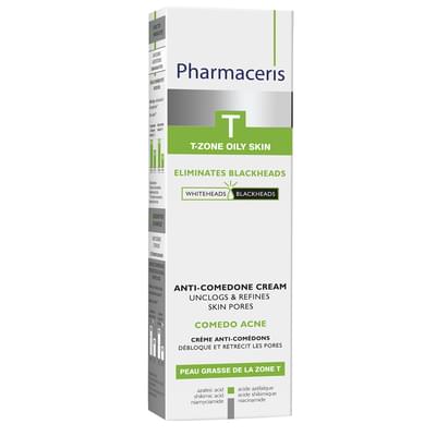 Крем для обличчя Pharmaceris T Comedo Acne від прищів та чорних крапок на основі комбінації солей шикімової кислоти та азелаїнової кислоти з додатковими антикомедогенними ефектами та освітленням від знебарвлення. Регулює процес відлущування та очищає забиті пори, підтримуючи виділення шкірного сала. Концентрована формула зменшує кількість і розмір відкритих і закритих комедонів, при цьому інтенсивно звужує пори та зменшує видимість шрамів від прищів. Препарат сильно нормалізує кількість виділеного шкірного сала, тим самим ефективно запобігаючи непривабливому блиску шкіри та утворенню нових вугрів.