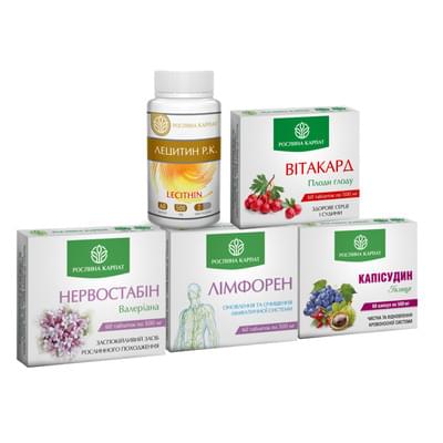 Набір Рослина Карпат Комплексна програма для серцево-судинної системи при атеросклерозі та підвищеному тиску є комплексом з 5 біологічно активних добавок, що разом складають курсову програму спрямовану на підтримку серцево-судинної системи та контролю атеросклерозу та підвищеного артеріального тиску. Допоможе зміцнити судини, знизити тиск та поліпшити роботу серця.