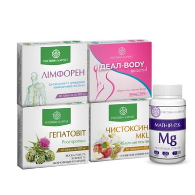 Набір Рослина Карпат Комплексна програма Нормалізація обміну речовин і схуднення 1 курс є комплексом з 5 біологічно активних добавок, що разом складають курсову програму, спрямовану на нормалізацію обміну речовин і схуднення. Ця програма створена для тих, хто хоче ефективно та безпечно позбутися зайвих кілограмів, очистити організм від токсинів і налагодити роботу всіх систем.
