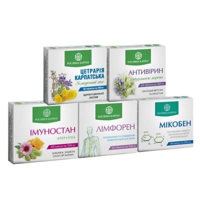 Набір Рослина Карпат Комплексна програма при захворюванні верхніх дихальних шляхів, ГРВІ, ГРЗ є комплексом з 5 біологічно активних добавок, що разом складають курсову програму спрямовану на підтримку здоров’я дихальної системи. Ця програма спрямована на зміцнення імунної системи, що допомагає організму боротися з інфекціями. Вона також сприяє зменшенню запалення в дихальних шляхах, що може зменшити симптоми, такі як нежить та кашель. Крім того, комплексна програма може покращити загальний стан здоров’я, збільшуючи енергію та витривалість.