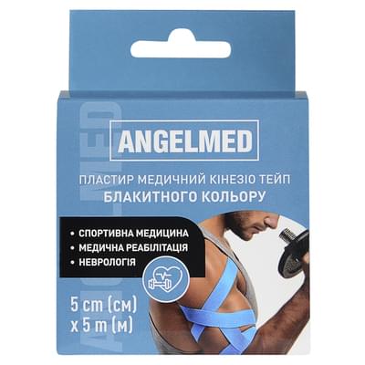 Ціна на Пластир медичний Angelmed Кінезіо тейп блакитний 5 м х 5 см 1 шт. стартує від 136.40 ₴ за упаковку.