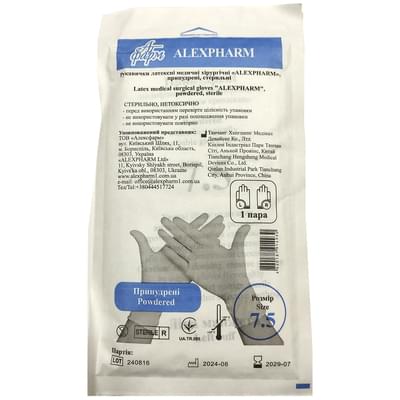 Рукавички хірургічні Alexpharm латексні стерильні припудрені (розмір 7,5, пара) можуть використовуватися при проведенні оперативних втручань, а також процедур де необхідно дотримуватися стерильності. Такі рукавички мають анатомічну форму (діляться на праву та ліву). Латексні стерильні рукавиці забезпечують максимальну чутливість рук хірурга під час операції.
