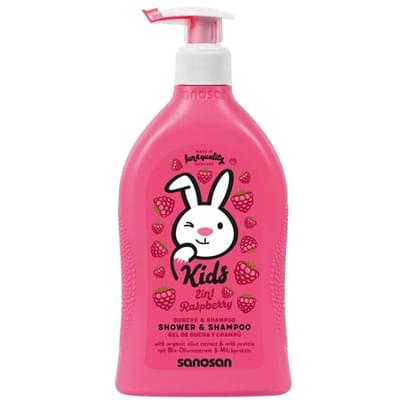 Sanosan Kids шампунь-гель 2 в 1 з ароматом малини для дітей від 2-х років. Дітям подобається веселий зайчик Санні та фруктовий малиновий аромат. Матусям подобається збагачена формула догляду з органічним екстрактом оливи, натуральним молочним білком та особливо м’якими очищуючими речовинами, які захищають ніжну дитячу шкіру від пересихання.