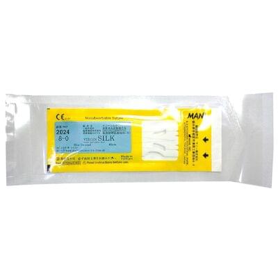 Шовний матеріал Вірджинський шовк Mani 2024 кручений 8/0 довжина 45 см, зі шпателеподібною подвійною голкою 3/8, довжина 6,5 мм, діаметр 0,2 мм блакитний